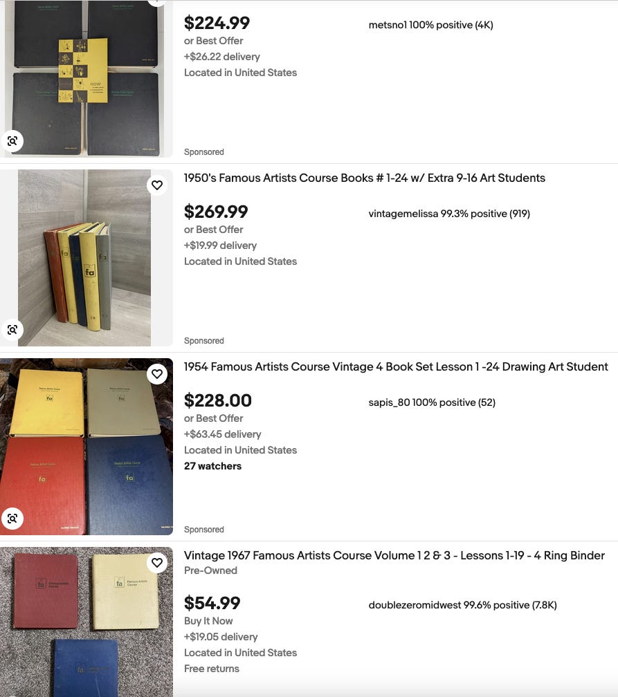 You can also get this condensed lesson book for about $20 on Amazon, but if I had the dosh, I’d go to ebay and get the whole set. There are not only lots of sets, but there are sets for different art needs, including fashion, painting, cartooning, and illustration.